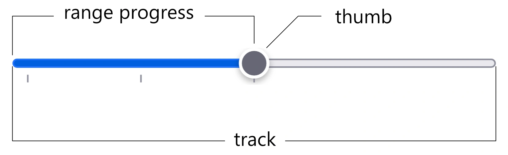 input range นั้นประกอบด้วยส่วนต่างๆ คือ ตัวปุ่มเลื่อนหรือ thumb, ตัวรางหรือ track, ตัวระดับที่เลือกหรือ range progress.