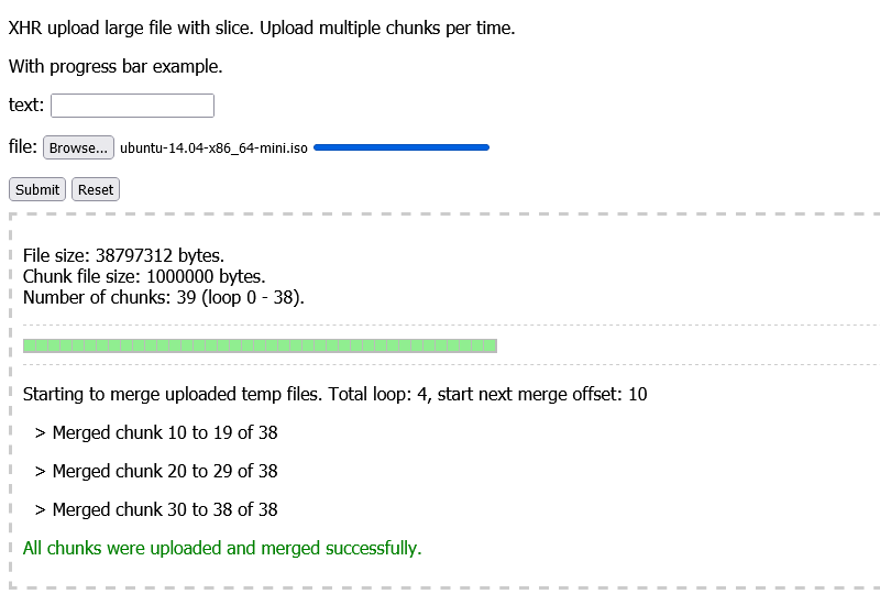 ในขั้นตอนนี้จะสังเหตุว่าค่า GET parameter ที่ส่งไปคือ chunkNumber จะเป็น -1 แล้วเพราะทาง php รองรับไว้ว่าค่านี้คือเริ่มทำการ merge. และเมื่อทำการวน merge จบครบจบแล้วก็จะได้ไฟล์ที่พร้อมใช้งาน และไฟลฺ์ temp ต่างๆก็จะถูกลบจนหมด. ทั้งนี้หากไฟล์ไม่ใหญ่เกินไป จะสามารถหาค่า md5, sha1 ของไฟล์เพื่อไปตรวจสอบกับไฟล์ต้นฉบับได้ด้วย.