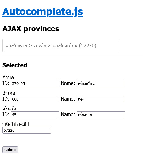 จากโค้ดตัวอย่างทั้งหมดด้านบนนั้น เมื่อทำการเปิดหน้า form.html ผ่าน web server ที่รองรับ PHP แล้วทำการกรอกคำค้นหา เช่น "เชียง" (โดยไม่ต้องมีเครื่องหมาย ") ตัวโปรแกรมจะค้นทุกอย่าง ทั้งชื่อตำบล, อำเภอ, จังหวัด ที่มีคำว่า"เชียง"มาแสดง และเมื่อผู้อ่านเลือกรายการใด ข้อมูลย่อยๆจะถูกส่งไปยังฟอร์มต่างๆ เช่น ID ของอำเภอ เป็นต้น.