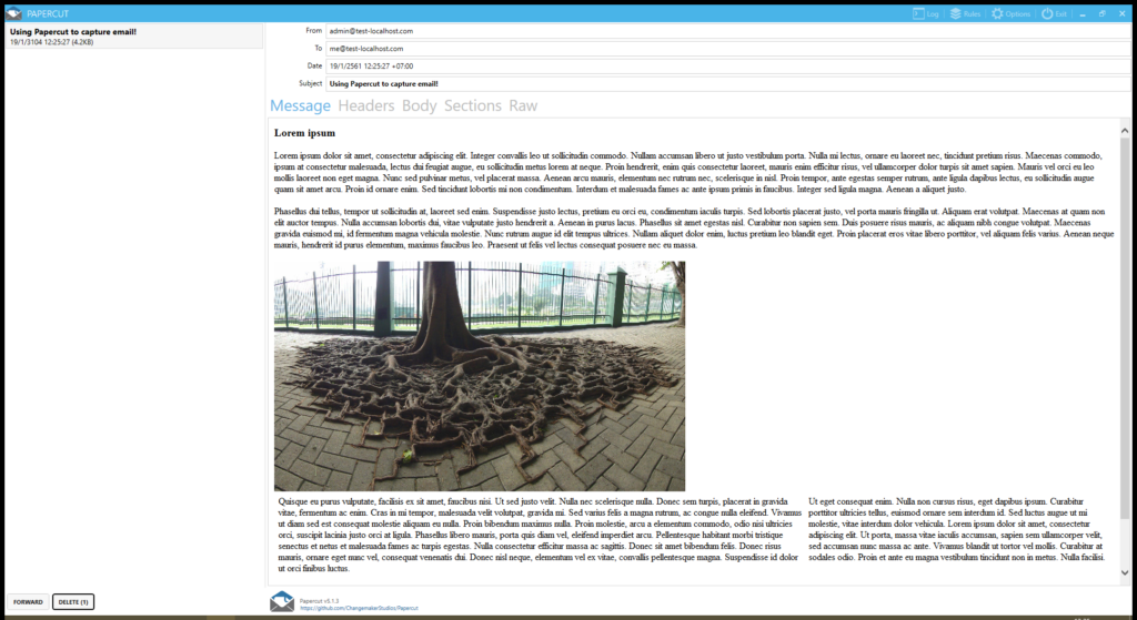 จากนั้นทดลองเรียกไฟล์เพื่อทำงาน ตัว Papercut จะดักจับอีเมลได้ทันทีและแจ้งเตือนให้เราเปิดอ่านดูเพื่อตรวจสอบเนื้อหาในอีเมลนั้น เป็นอันเสร็จสิ้นการทำงานทดสอบรับและดูเนื้อหาอีเมล.
