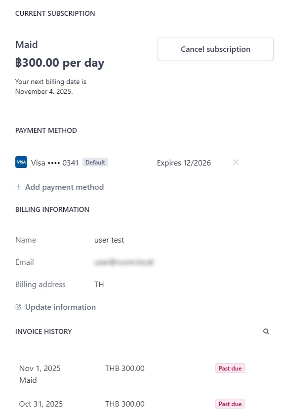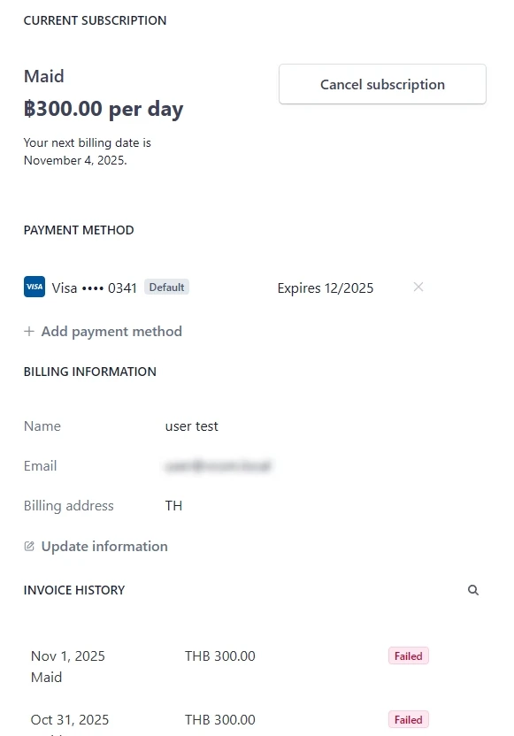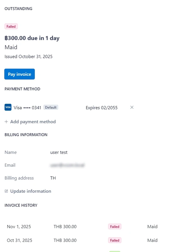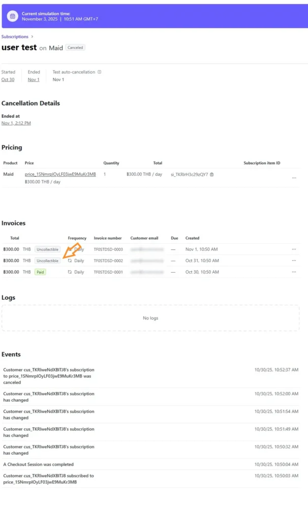 จากการทดสอบนี้ พบว่า หน้า customer portal จะยังคงมีปุ่มเรียกเก็บเงินเช่นเดียวกัน เนื่องจากตั้งค่าสถานะ payment fail สำหรับ subscription เป็น cancel. และการชำระเงินจนครบก็ไม่ช่วยเปลี่ยนสถานะเช่นเคย.