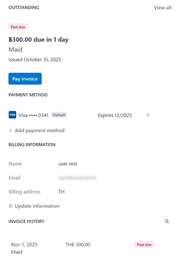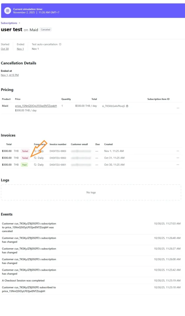 จากตัวอย่างจะพบว่าสิ่งที่แตกต่างจากการทดลองก่อนหน้าคือสถานะใบเรียกเก็บเงินจะเป็น Past due แทนที่จะเป็น Failed แต่สถานะ subscription จะยังคงไม่ยกเลิกและมีปุ่มให้ยกเลิกด้วยตัวเองเช่นเดิม.
