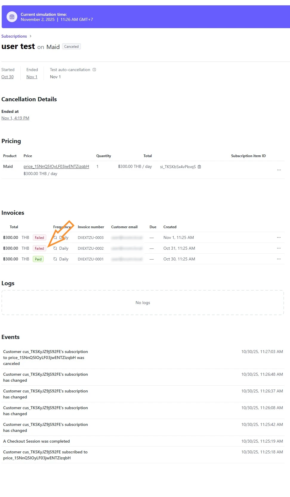 จากตัวอย่างการตั้งค่าแบบนี้ จะพบว่าในหน้า Customer portal รายการ subscription จะยังคงไม่ถูกยกเลิก มีเพียงรายการเรียกเก็บเงินที่แจ้งว่าล้มเหลว (Failed) และเมื่อทดลอง Run simulation ข้ามเวลาไปเรื่อยๆก็จะพบว่ามันยังคงอยู่เหมือนเดิมไม่มีการยกเลิก แต่จะมีปุ่มให้กดยกเลิกด้วยตัวเอง.