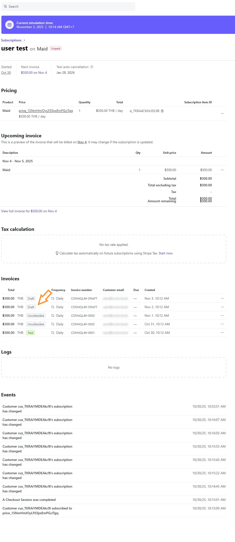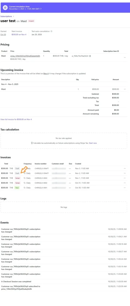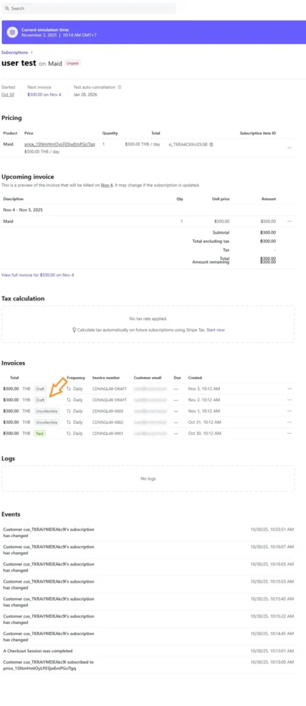 ในหน้า Dashboard นั้น จากการ Run simulation ข้ามเวลาไปเรื่อยๆจะพบว่าแม้เลยขีดกำหนดไปเรื่อยๆเท่าไหร่ มันก็จะยังคงสร้าง draft ของใบเรียกเก็บเงินออกมาอยู่เรื่อยไป และสถานะของ subscription จะเป็น Unpaid ไม่ใช่ Canceled.